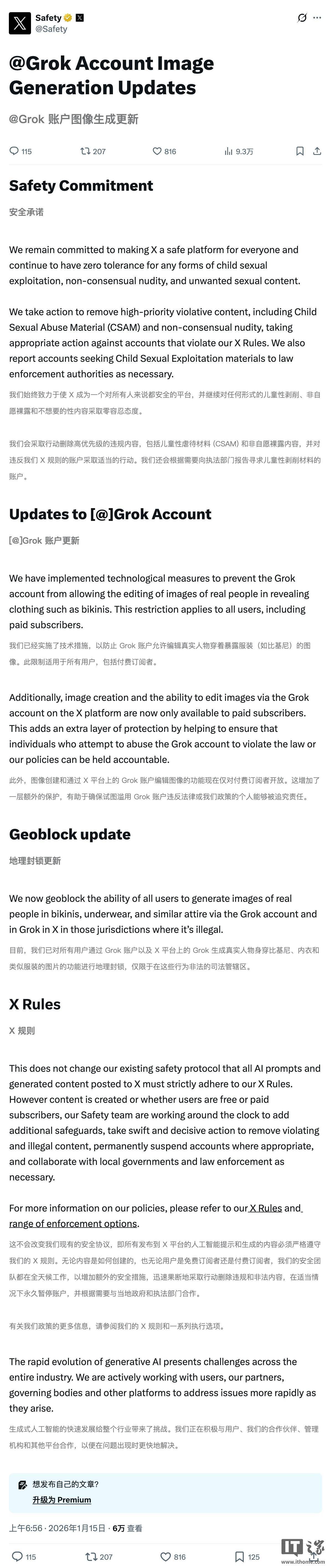 X 正在声明中强调,Grok 理论上只应对应生成虚形成年人的上半身裸露内容,此类会根据分歧地域的法令要求做出调整。xAI 决定将 Grok 的图像生成功能全面纳入付费订阅系统,